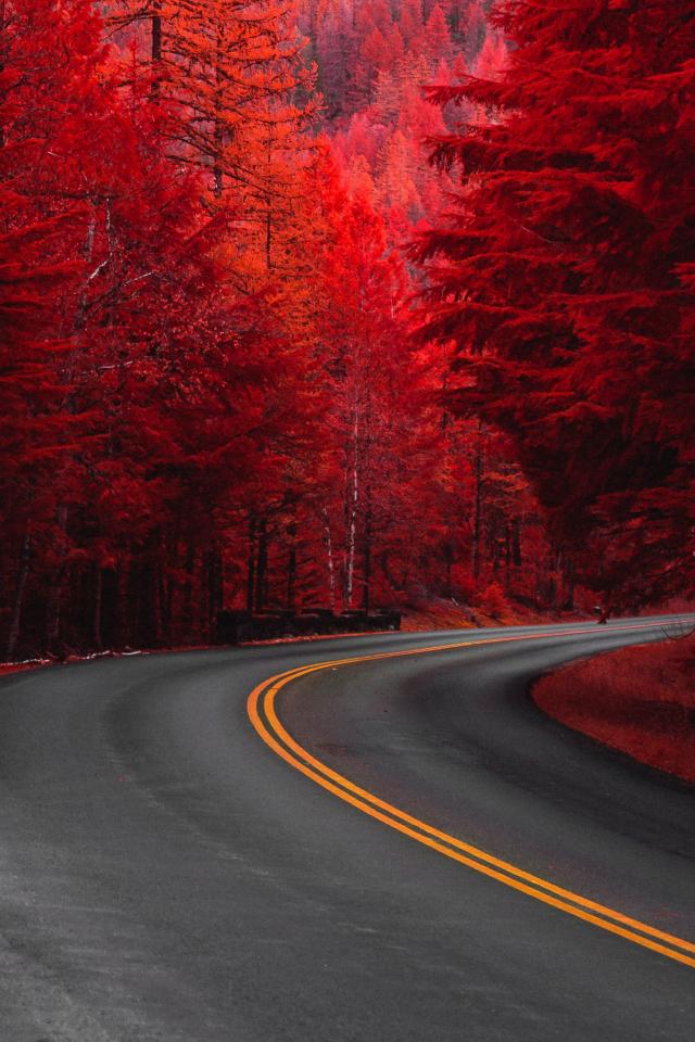 Обои Деревья с красными листьями у дороги осенью
