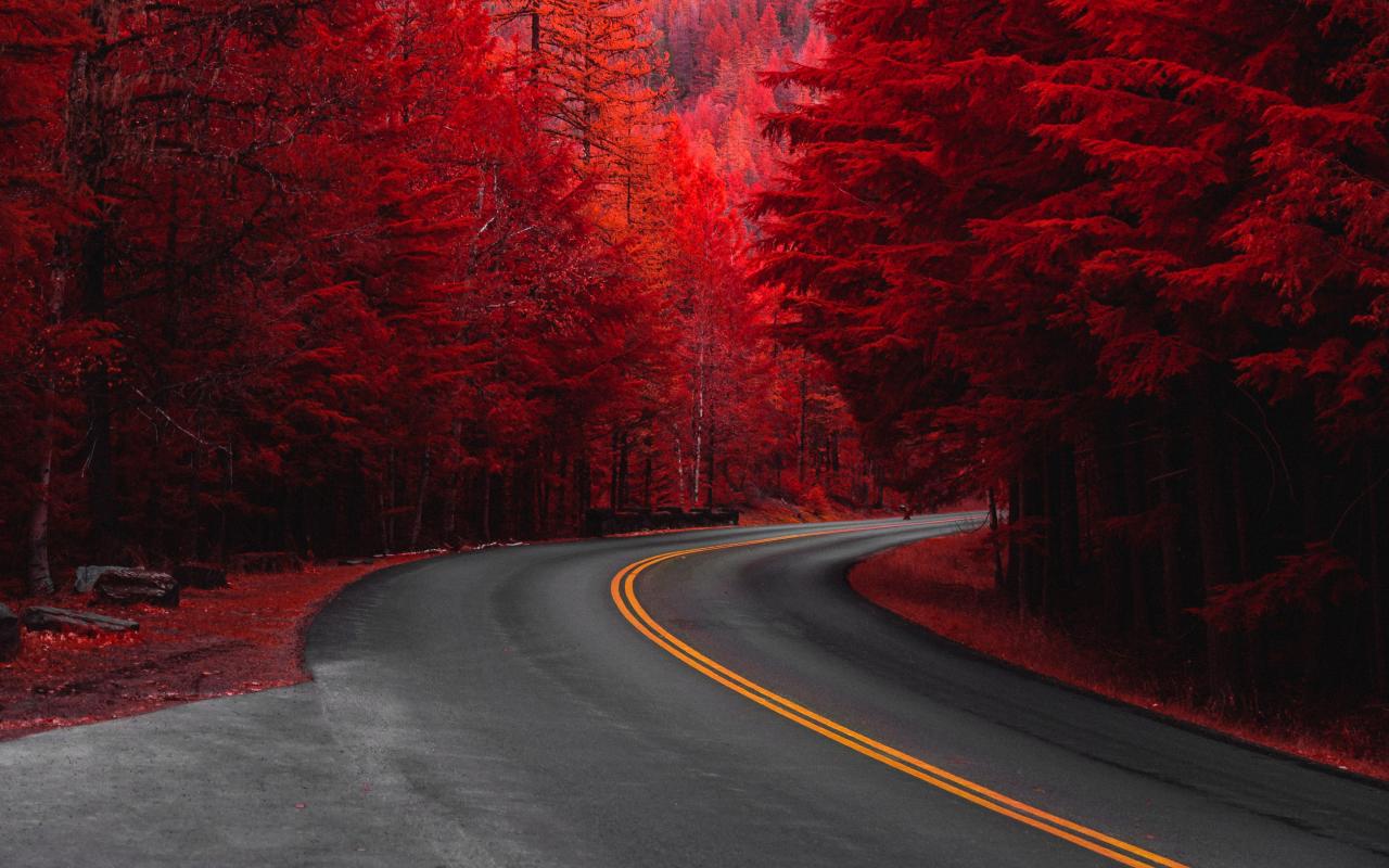 Обои Деревья с красными листьями у дороги осенью