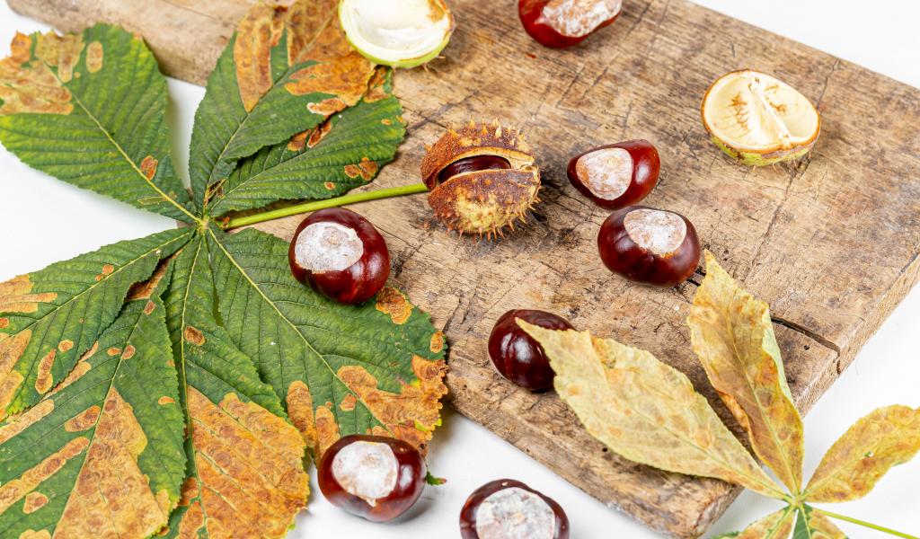 Обои Каштаны с сухими листьями на доске