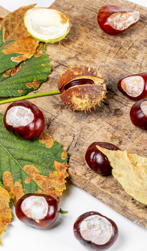 Обои Каштаны с сухими листьями на доске