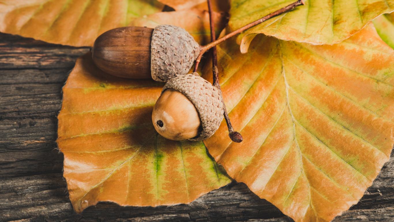 Обои Два желудя с листьями на деревянном столе