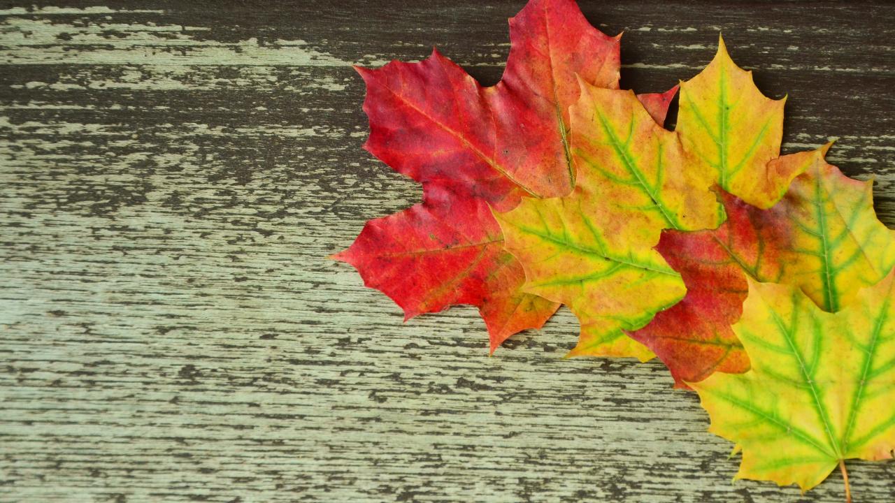 Обои Разноцветные кленовые листья на деревянном столе
