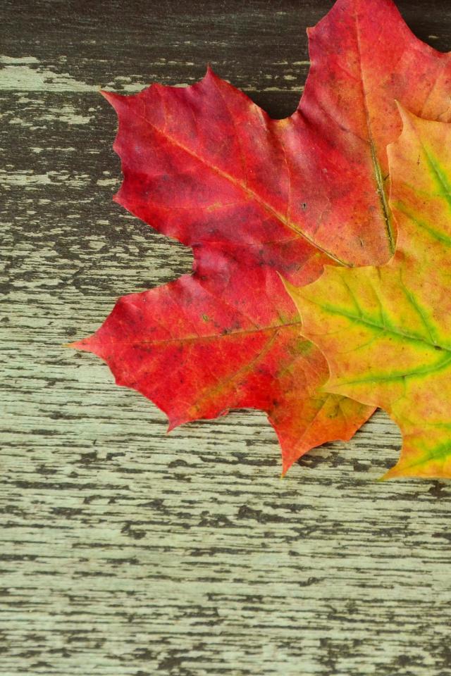 Обои Разноцветные кленовые листья на деревянном столе