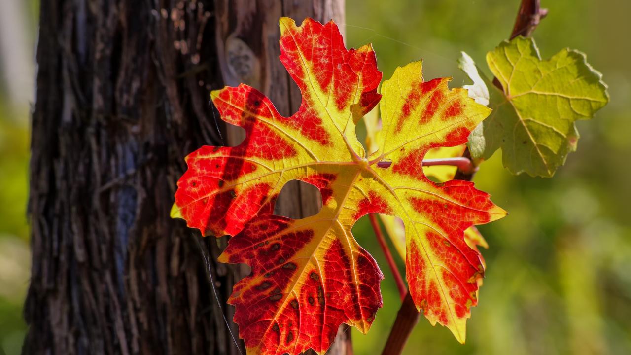 Обои Красный лист на виноградной лозе осенью