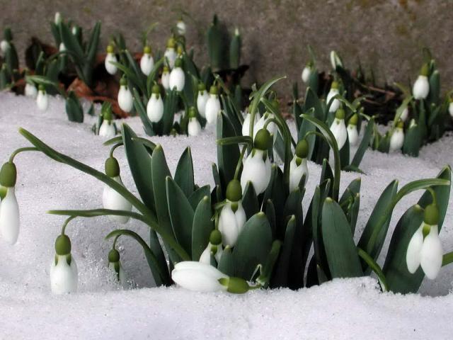 Обои Первоцветы подснежники под тающим весенним снегом