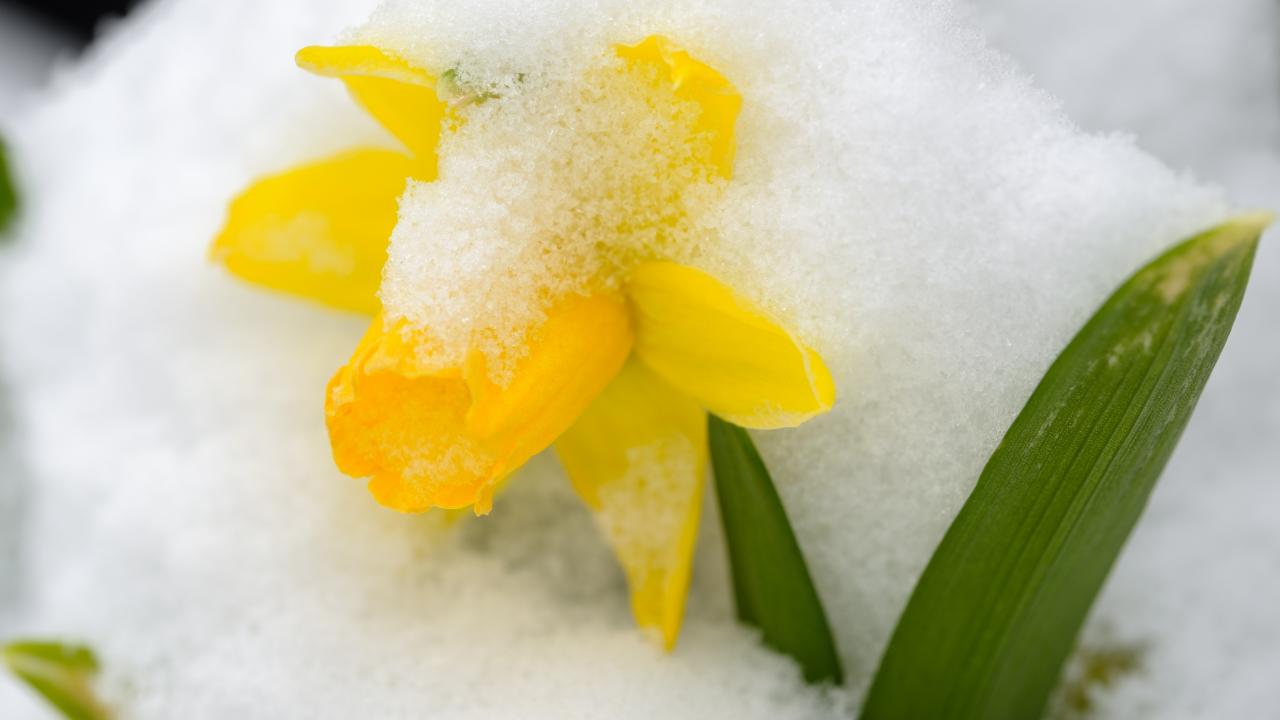 Обои Желтый цветок нарцисса в снегу в марте