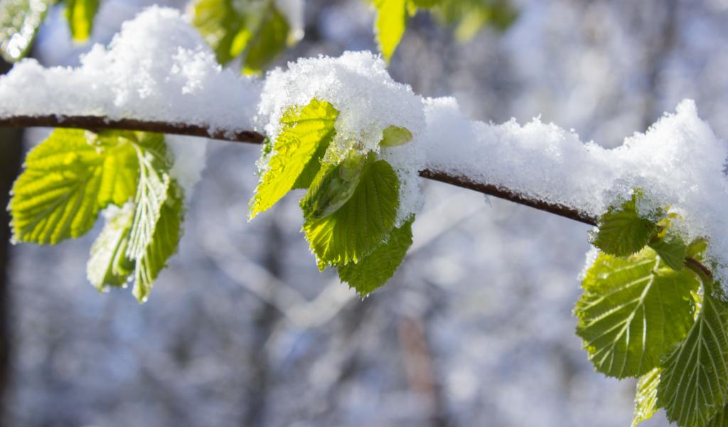 Обои Снег на ветке с зелеными листьями весной
