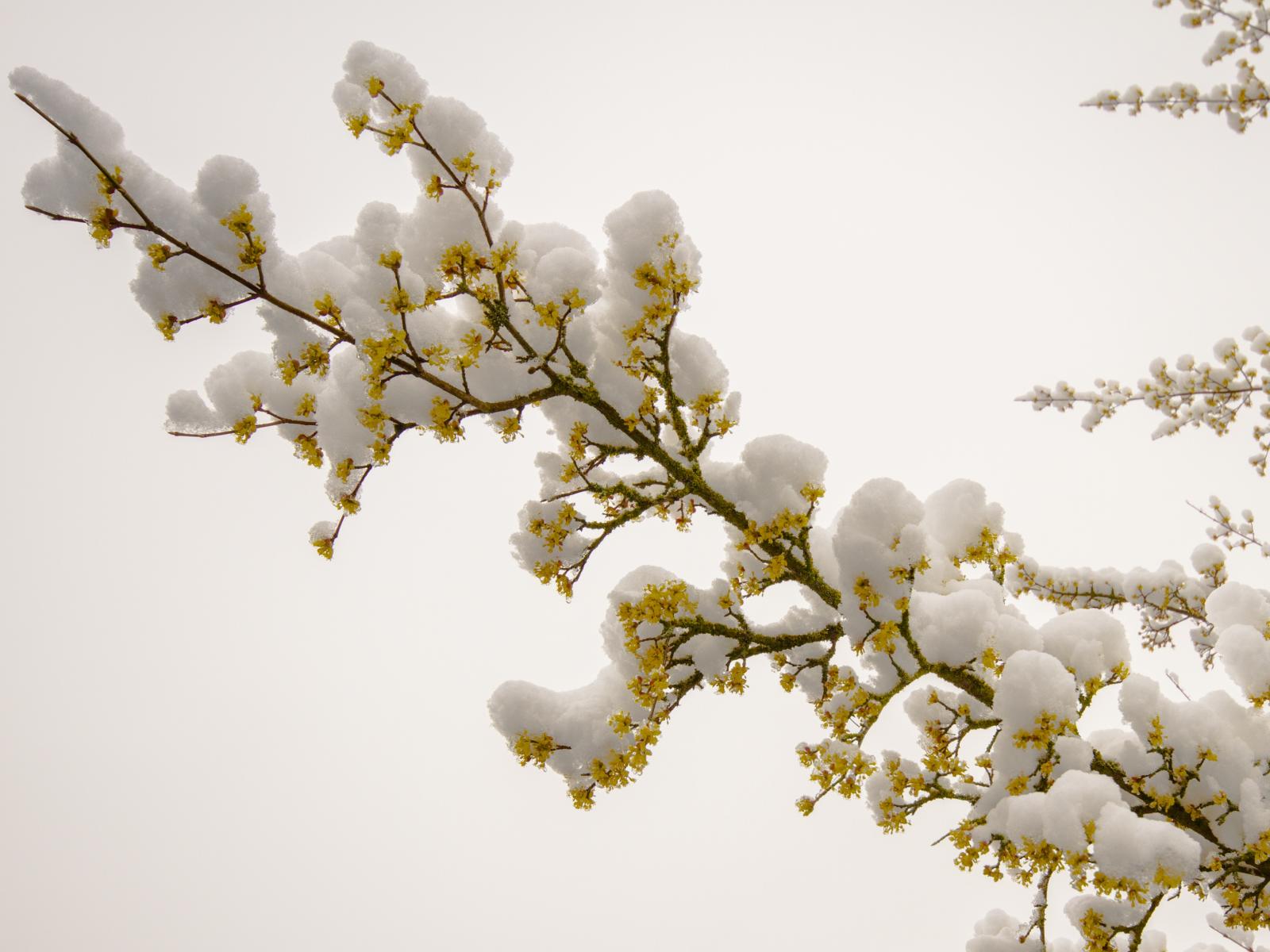 Обои Снег лежит на цветущей ветке в марте