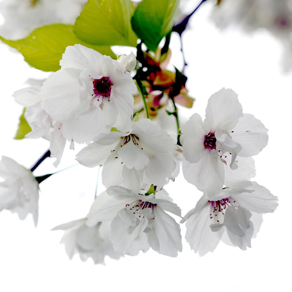 Обои Белые цветы черешни с зелеными листьями на столе с лентой