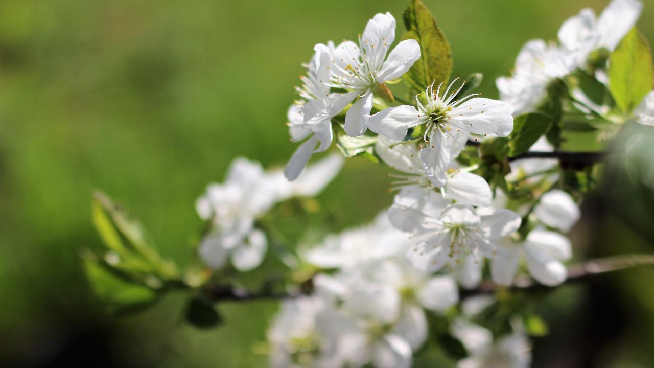 Обои Белые цветы вишни на ветке весной крупным планом