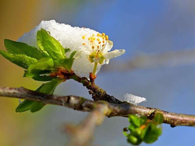 Обои Снег лежит на цветущей ветке вишни весной