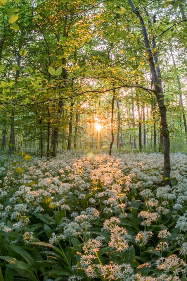 Обои Много белых цветов в весеннем лесу в лучах солнца