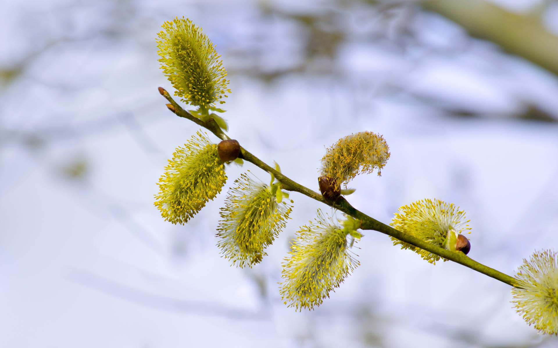Обои Зеленые распустившиеся котики на ветке вербы