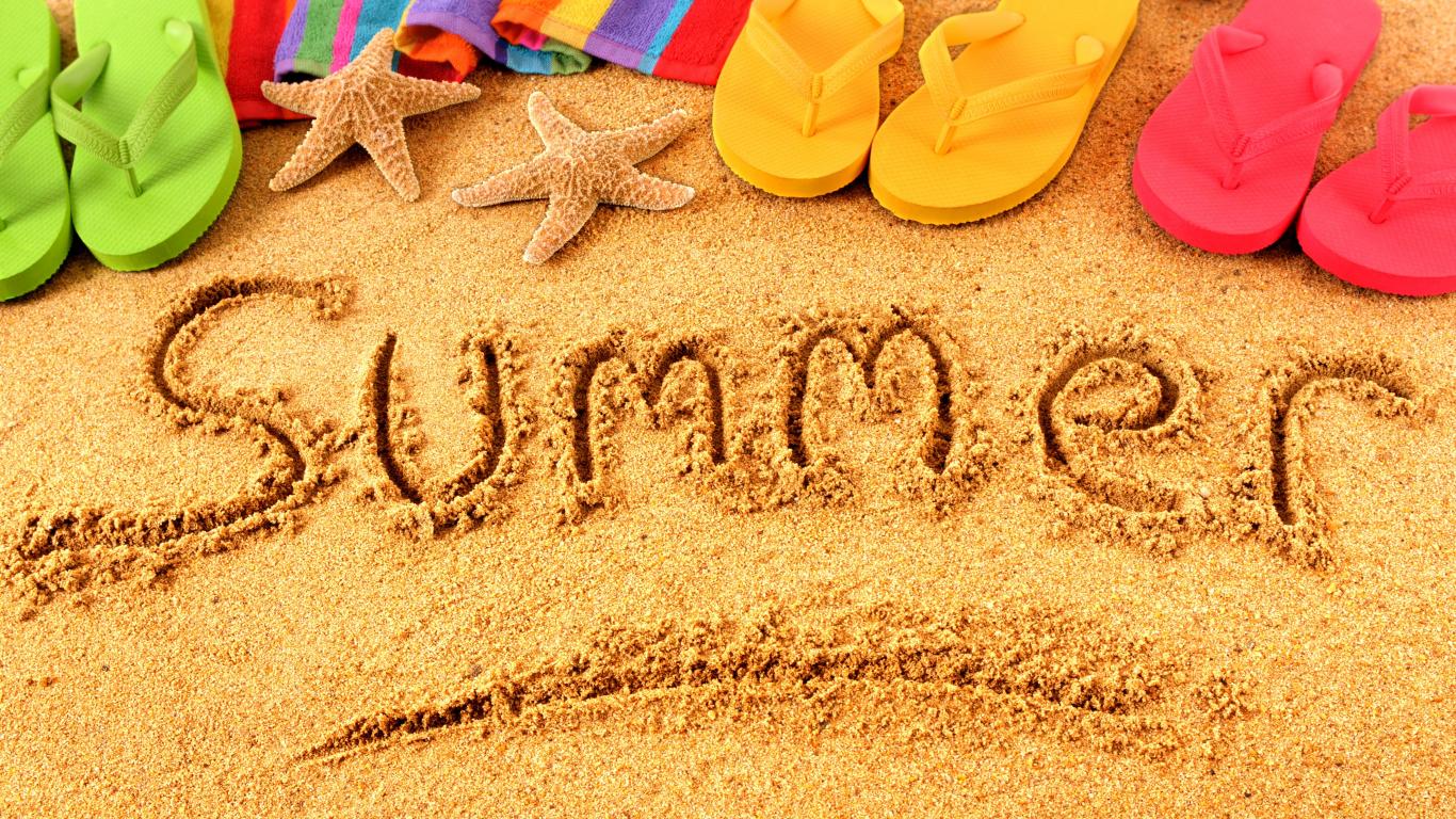 Обои Надпись лето на английском на песке с шлепками