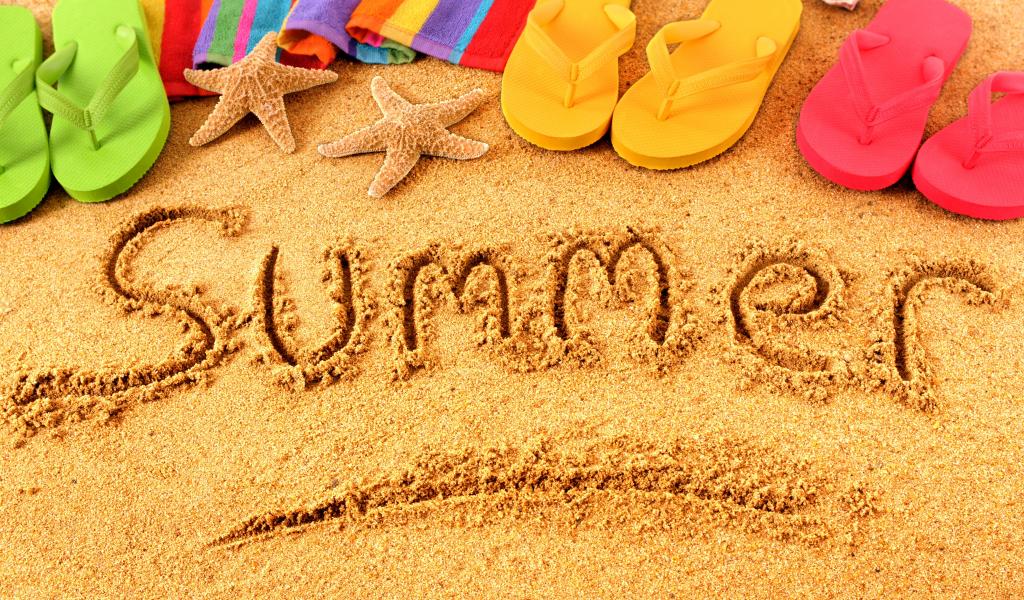 Обои Надпись лето на английском на песке с шлепками