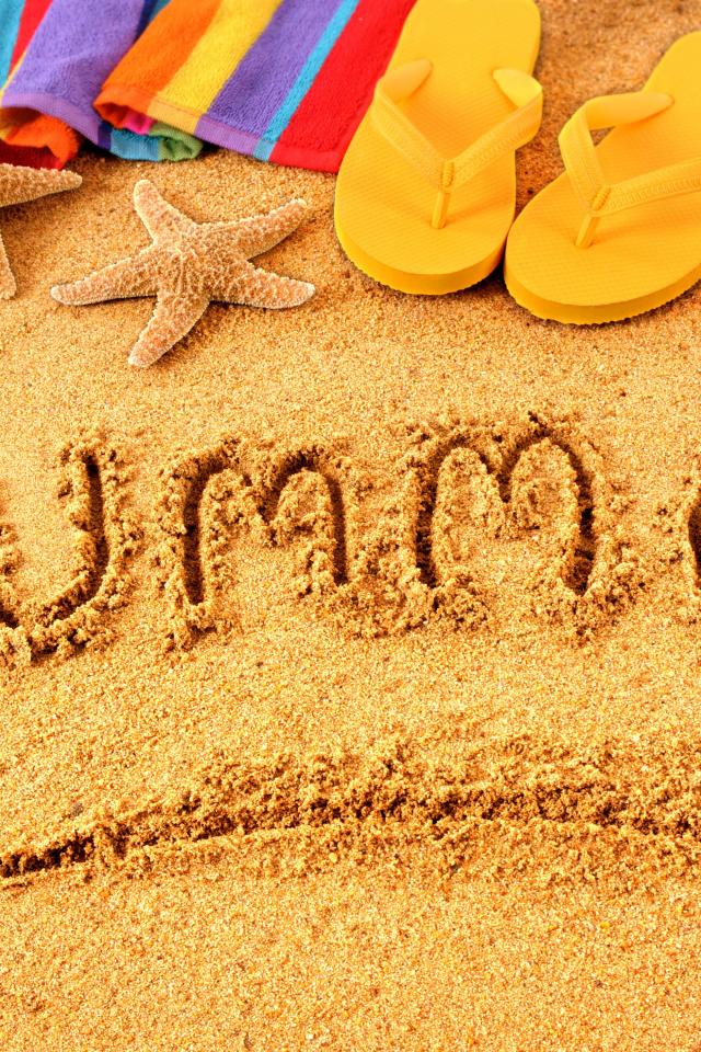 Обои Надпись лето на английском на песке с шлепками