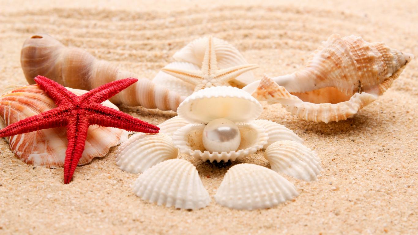 Обои Разные ракушки с белой жемчужиной на желтом песке