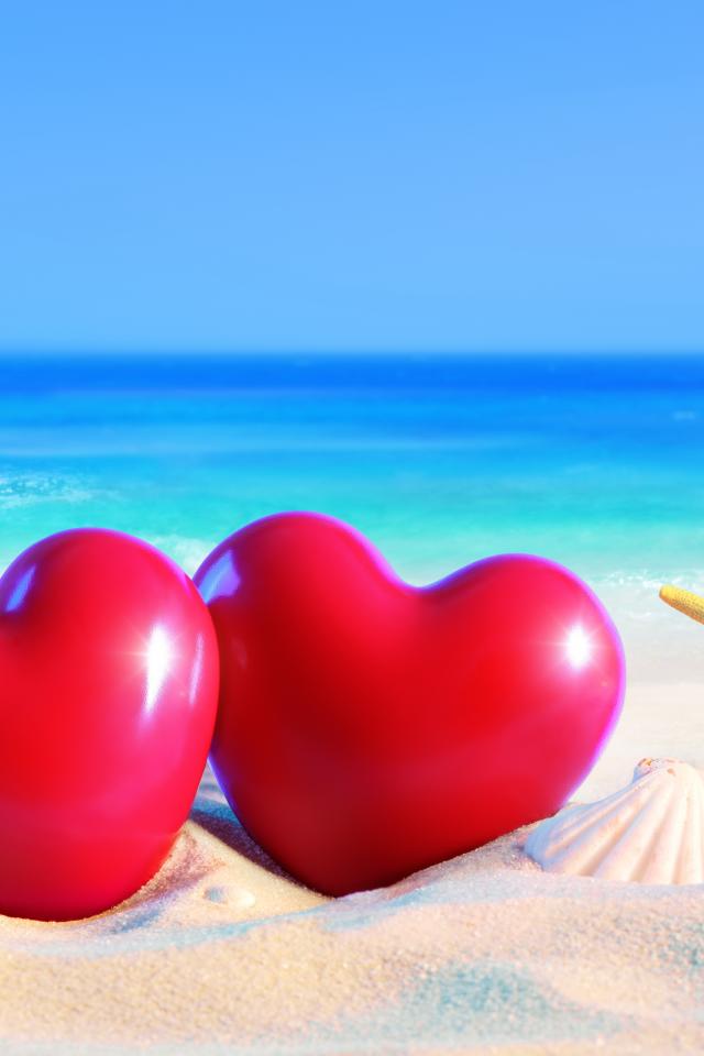 Обои Два красных сердца на пляже с морскими звездами летом