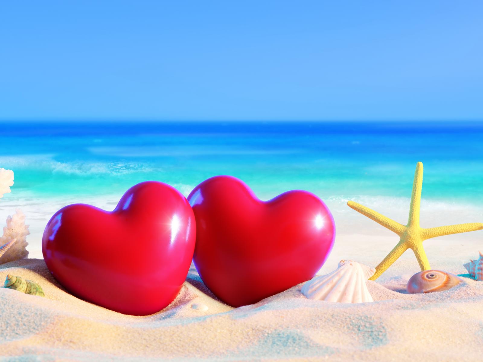Обои Два красных сердца на пляже с морскими звездами летом