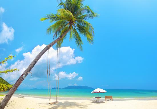 Обои Качеля на пальме на пляже с белым песком