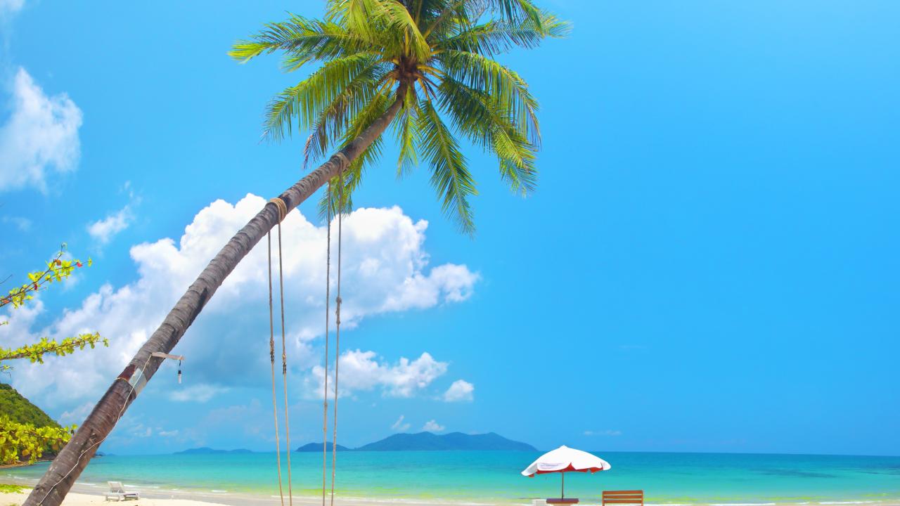 Обои Качеля на пальме на пляже с белым песком