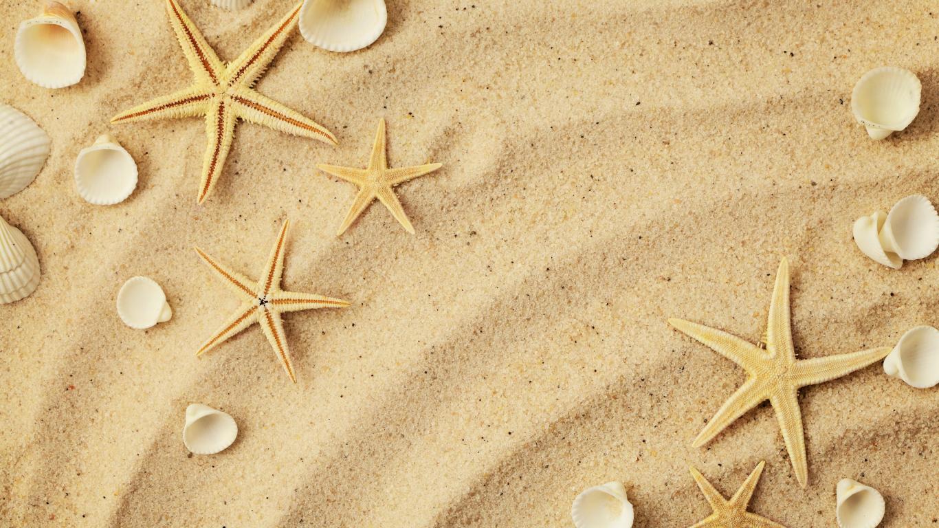 Обои Морские звезды с белыми ракушками на желтом песке