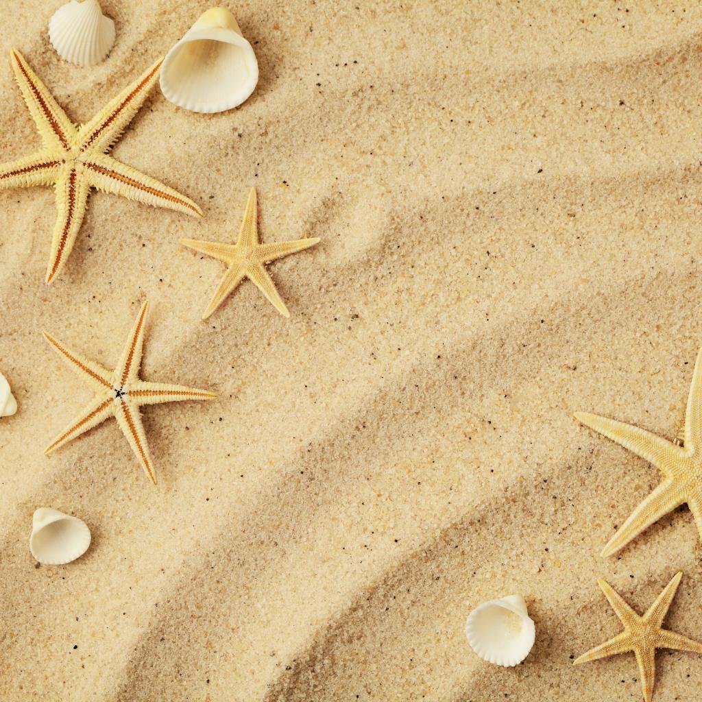 Обои Морские звезды с белыми ракушками на желтом песке