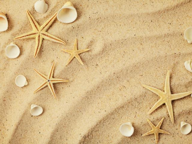 Обои Морские звезды с белыми ракушками на желтом песке