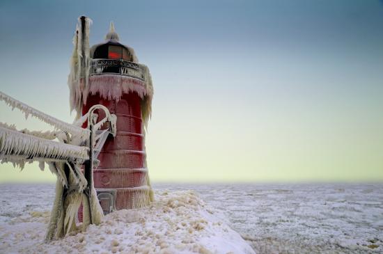 Обои Красный маяк покрыт льдом и сосульками