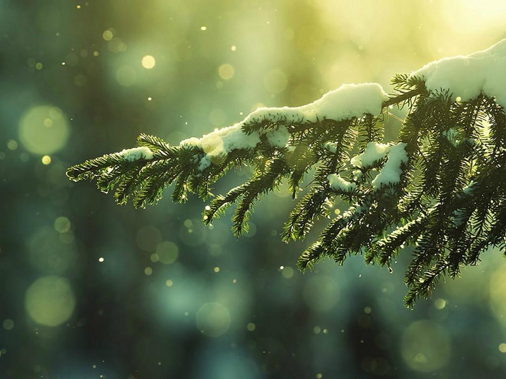 Обои Снег падает на ветви ели в лучах солнца