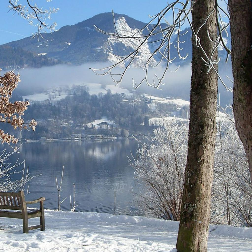 Обои Скамья на берегу озера в зимних горах