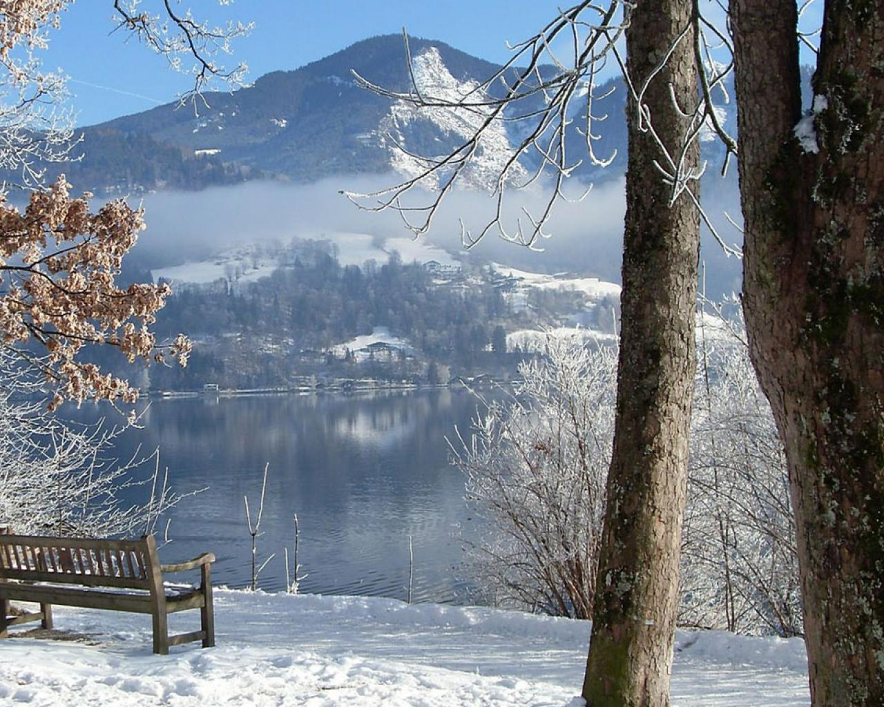 Обои Скамья на берегу озера в зимних горах