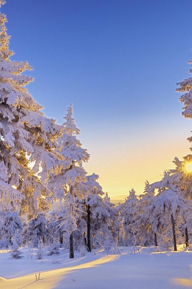 Обои Лучи солнца в заснеженном лесу