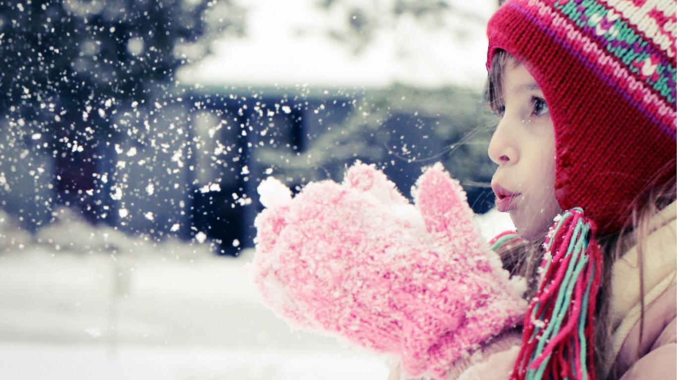 Обои Девочка сдувает белый снег с варежек
