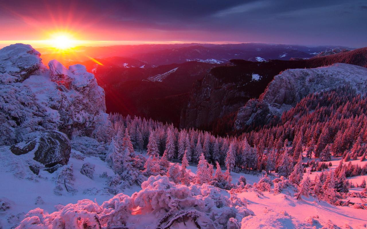 Обои Розовый зимний рассвет над лесом