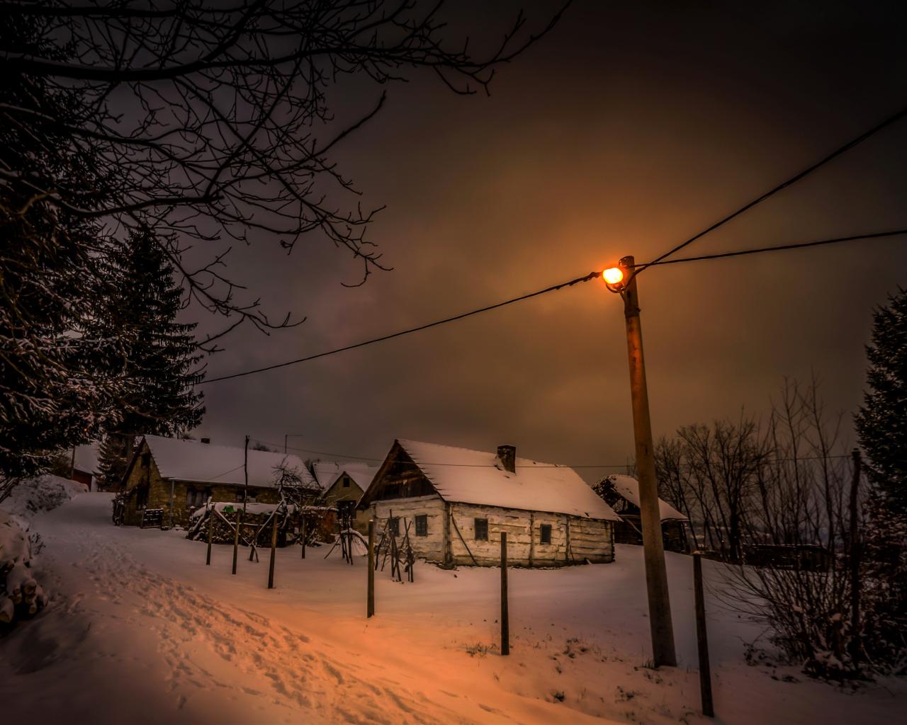 Обои Покрытые снегом дома на зимней улице ночью