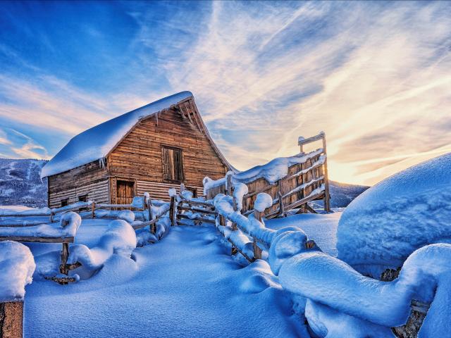 Обои Покрытый снегом дом в горах под красивым небом
