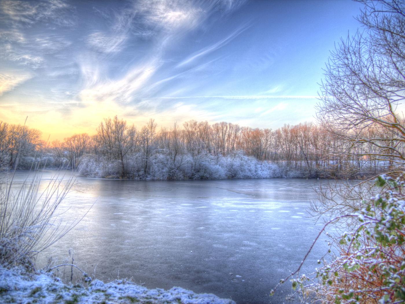 Обои Заледеневшая река в лесу под красивым зимним небом