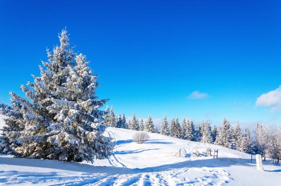 Обои Заснеженная ель под чистым голубым зимним небом