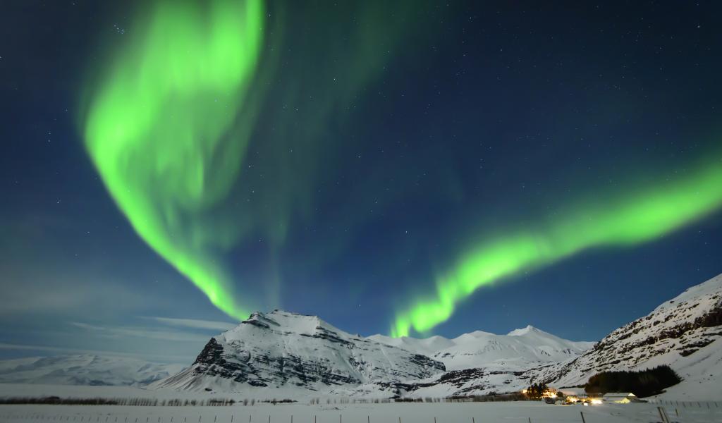 Обои Полярное сияние в небе над заснеженными горами, Исландия
