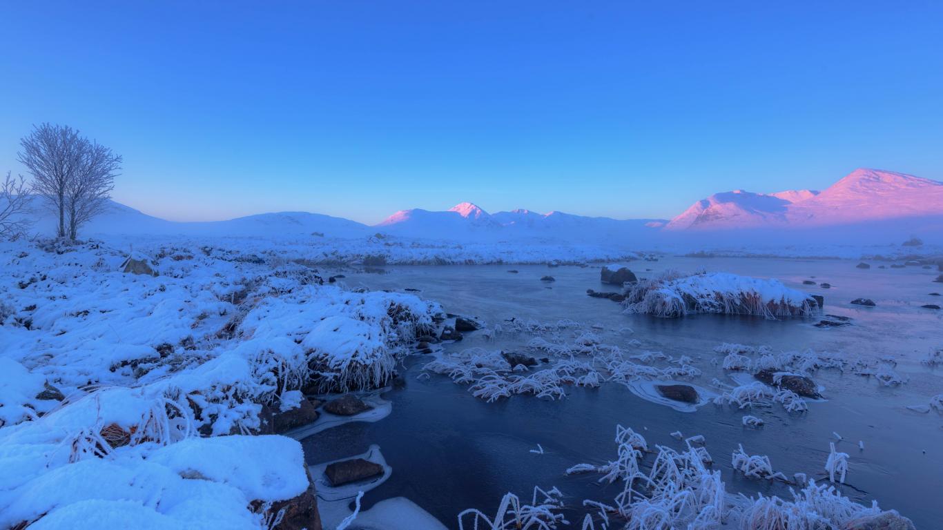 Обои Розовый закат солнца над заснеженными горами и покрытым льдом озером