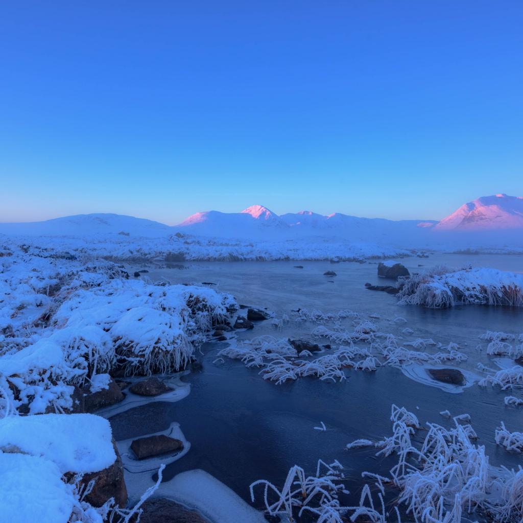 Обои Розовый закат солнца над заснеженными горами и покрытым льдом озером