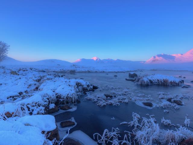 Обои Розовый закат солнца над заснеженными горами и покрытым льдом озером