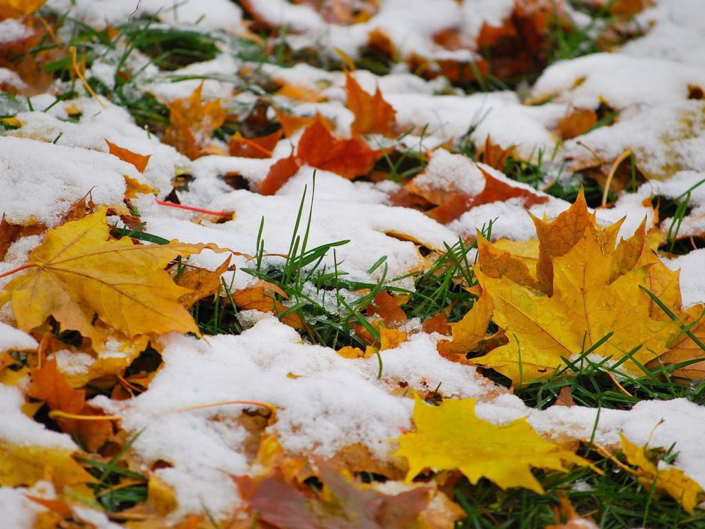 Обои Желтые листья покрыты первым зимним снегом