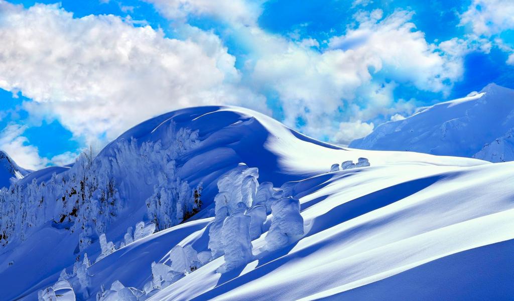 Обои Заснеженные деревья на склоне горы под голубым небом