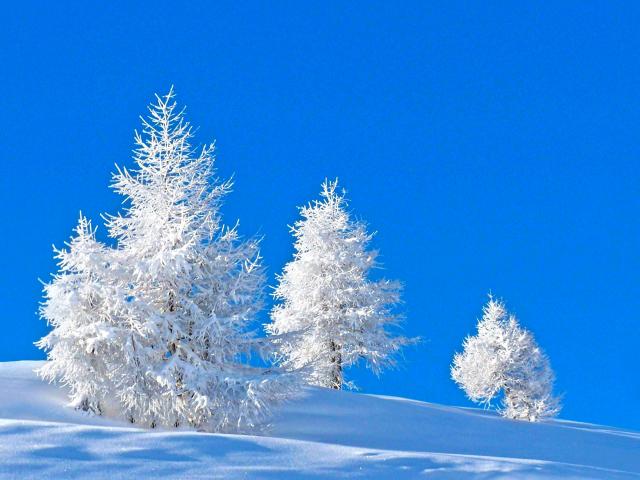 Обои Покрытые инеем ели на голубом фоне зимой
