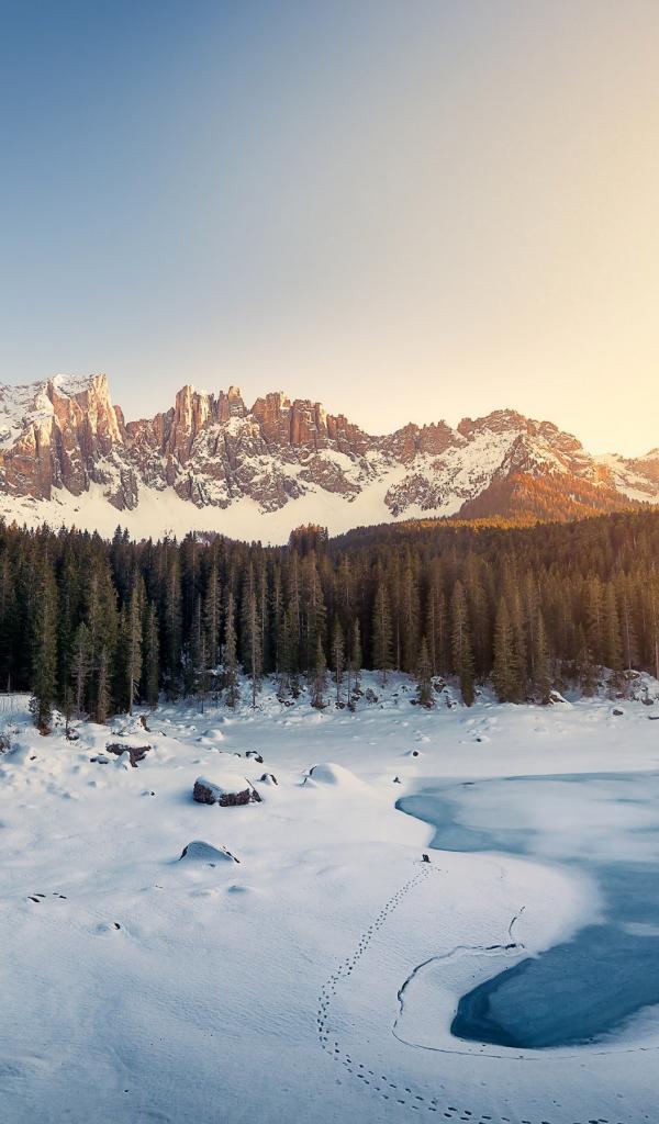 Обои Следы на заледеневшем озере на фоне гор
