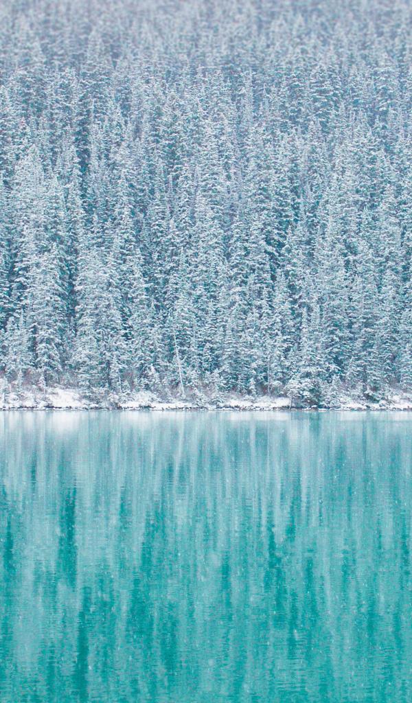 Обои Заснеженные ели у голубого озера зимой