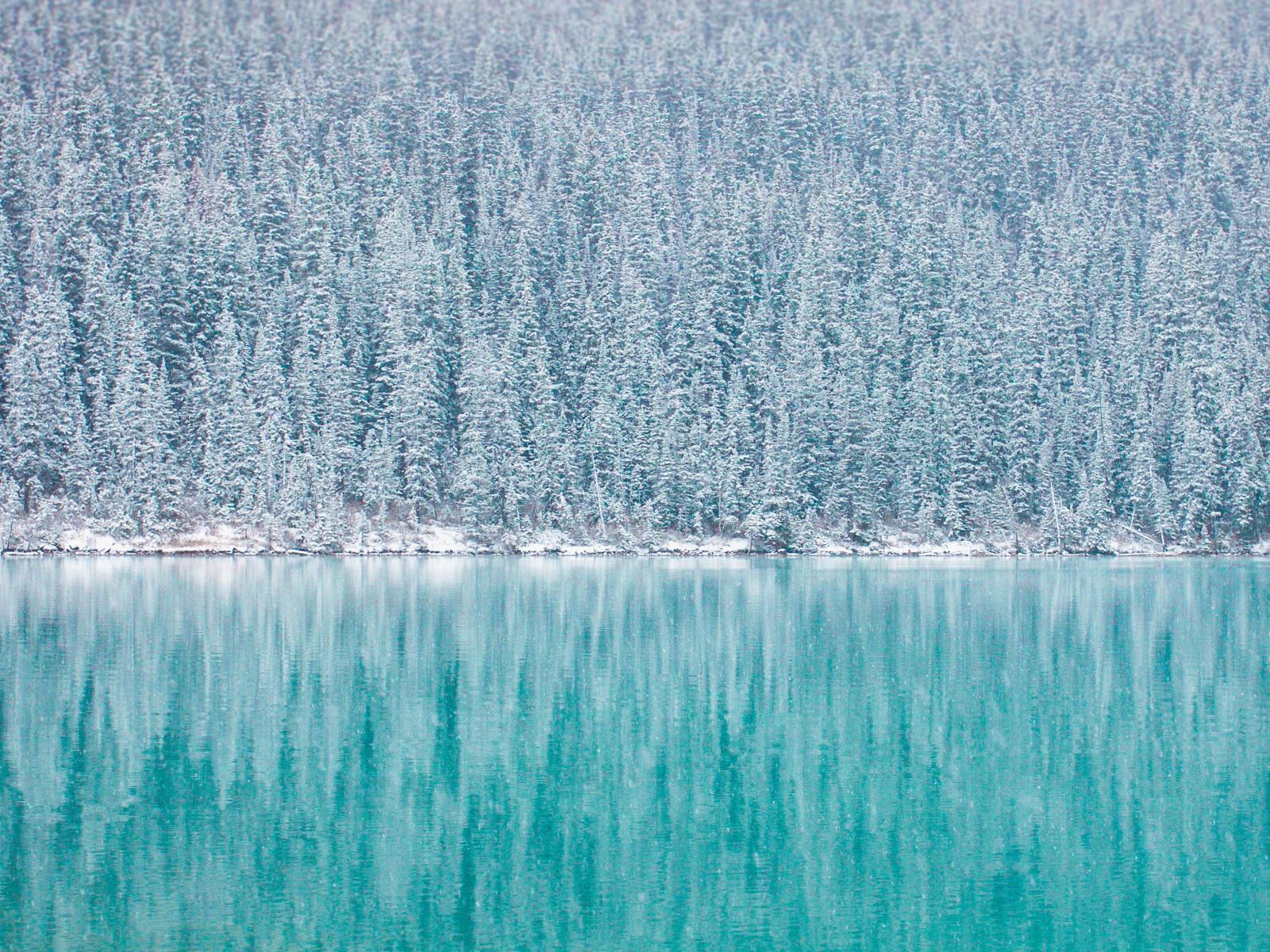 Обои Заснеженные ели у голубого озера зимой