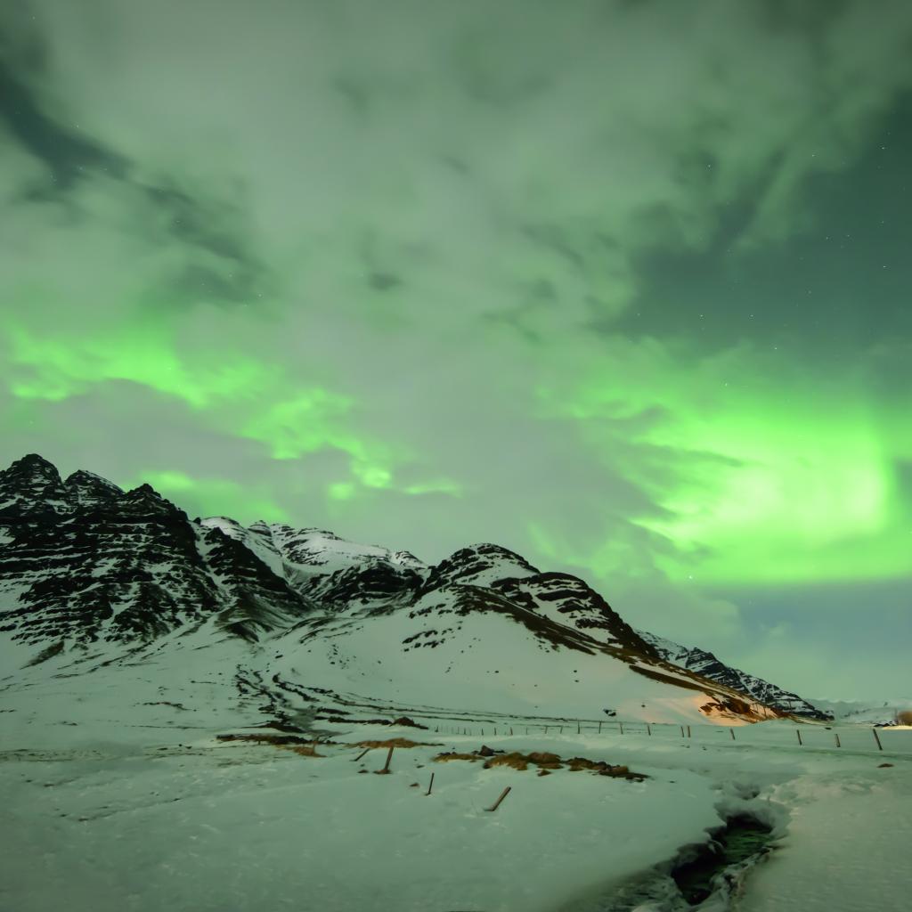 Обои Зеленое северное сияние над заснеженными горами в Исландии зимой
